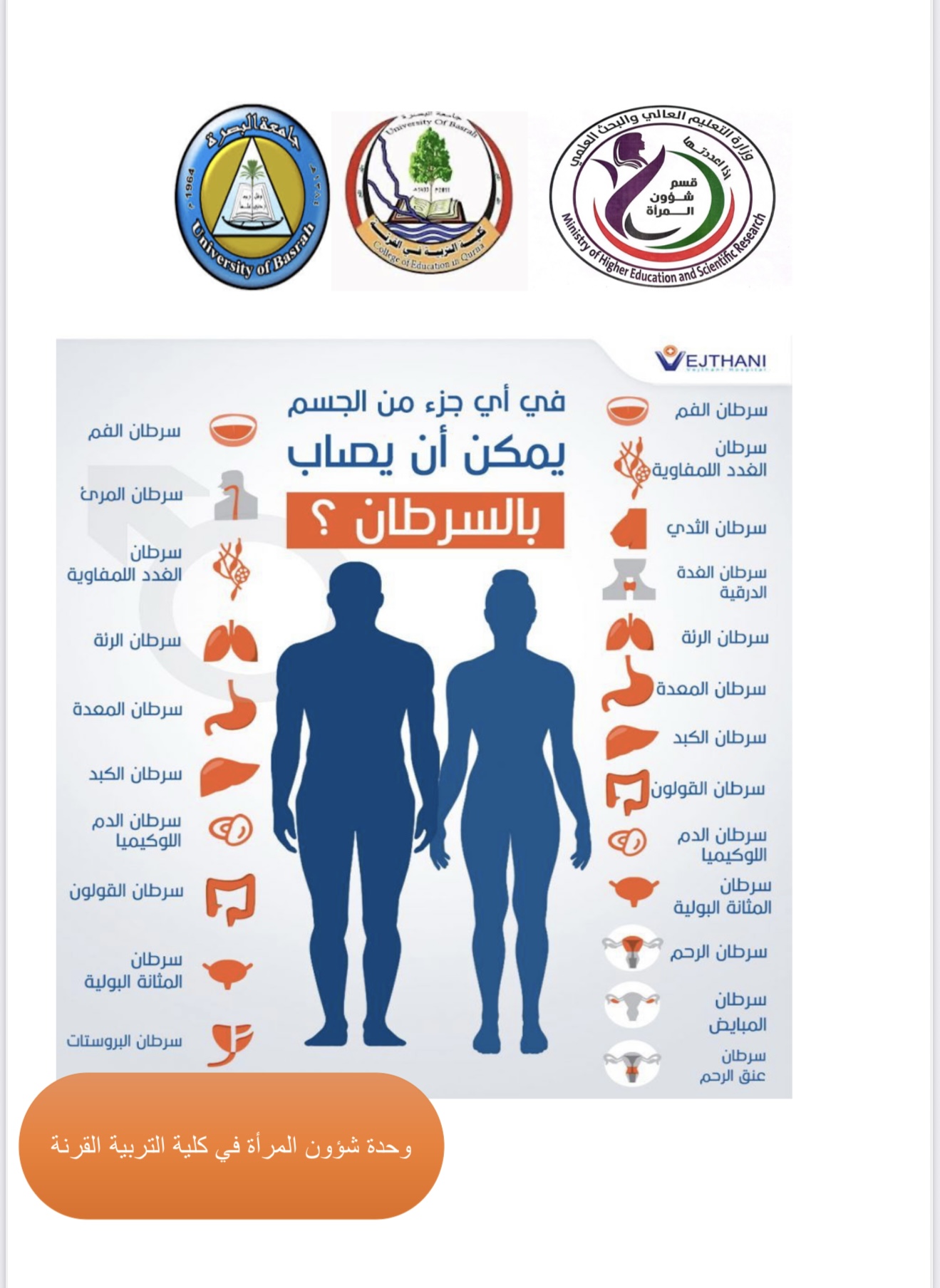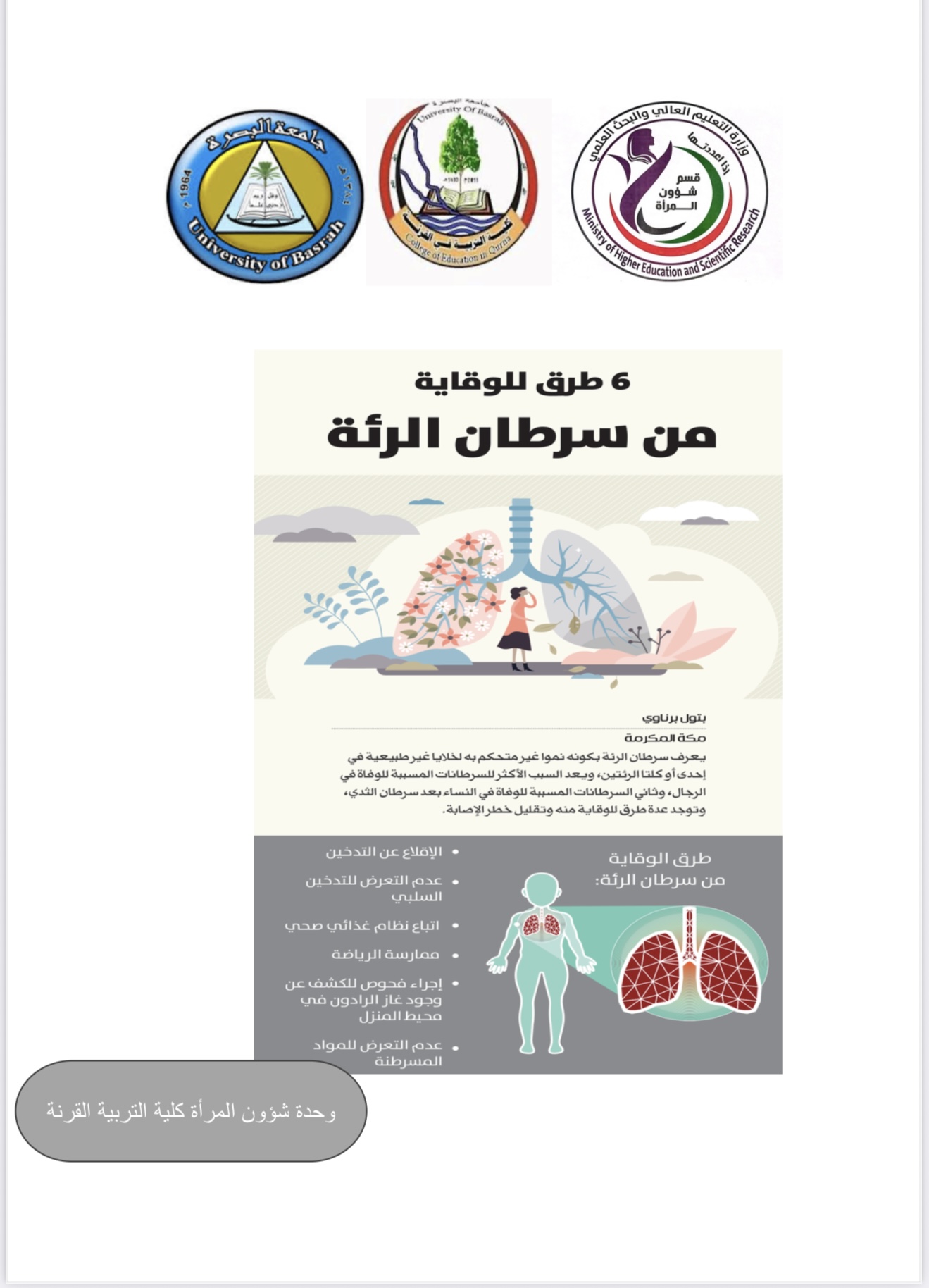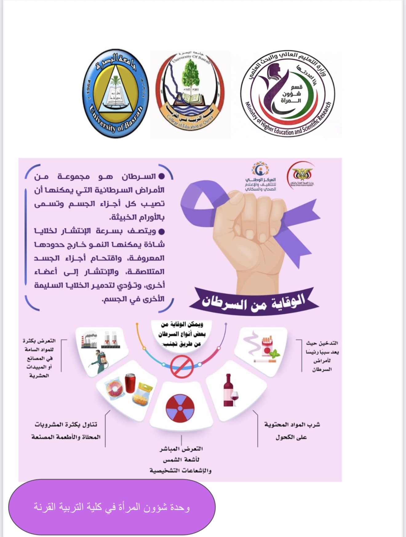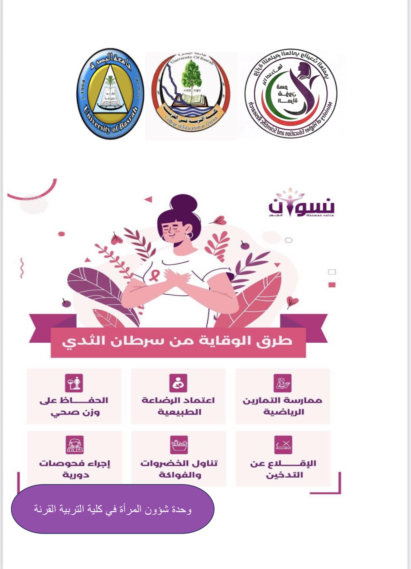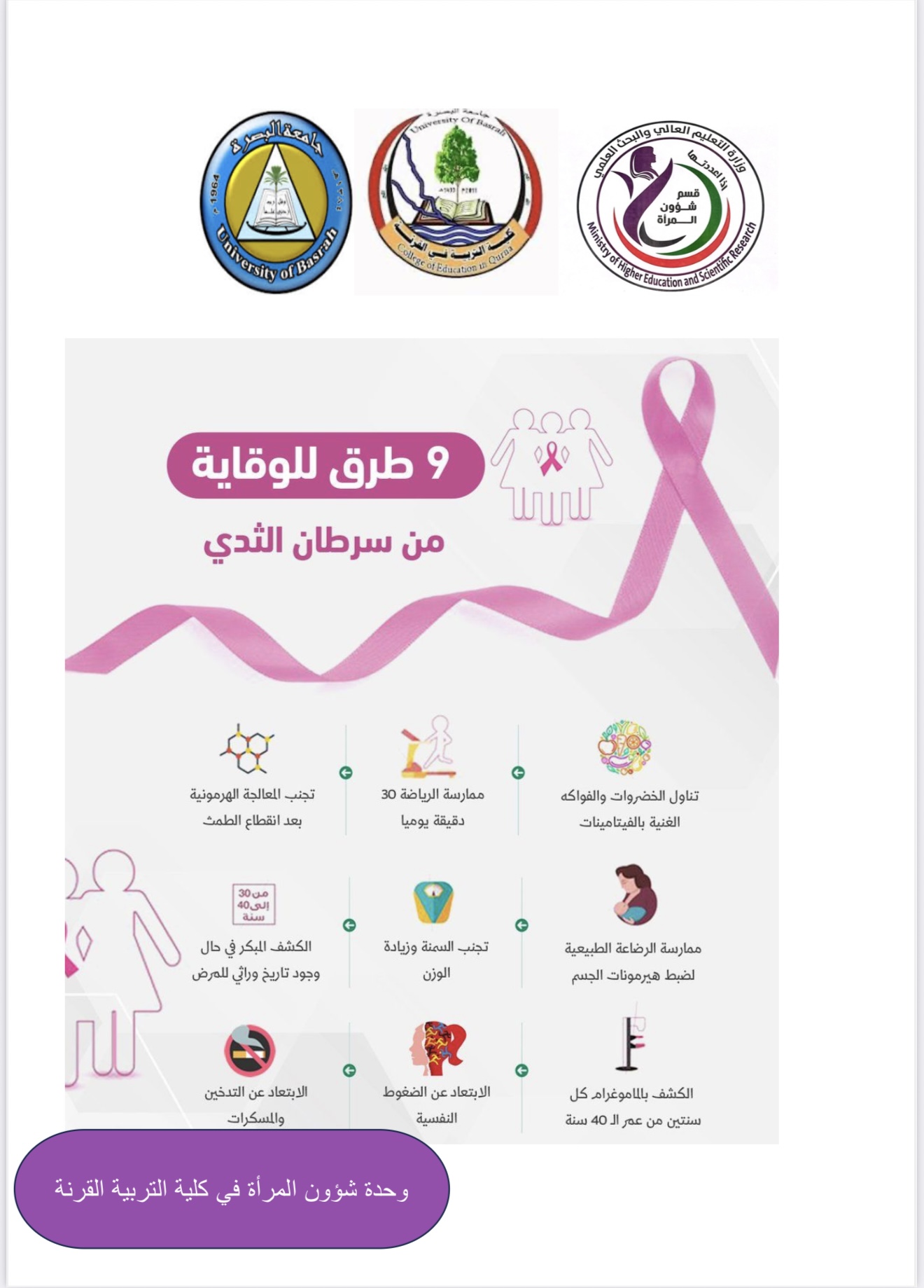 نظّمت كلية التربية/القرنة في جامعة البصرة حملة إلكترونية توعوية بمناسبة شهر أكتوبر الوردي، شهر التوعية بسرطان الثدي، تضمنت نشر بوسترات تثقيفية في مواقع الكلية والتجمّعات الطلابية، بهدف نشر الوعي حول أهمية الكشف المبكر وأساليب الوقاية من المرض.