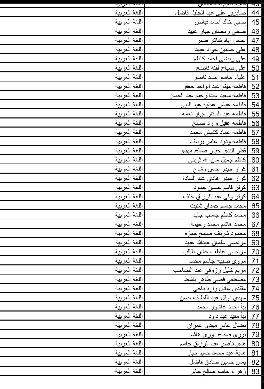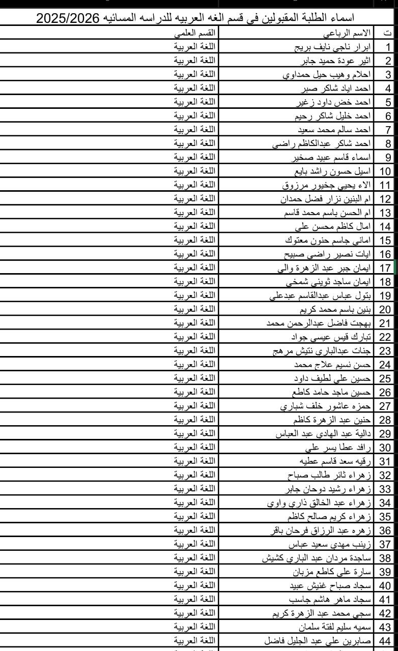 تُعلن كلية التربية/القرنة عن أسماء الطلبة المقبولين في الدراسة المسائية – قسم اللغة العربية للعام الدراسي 2025-2026، وتدعوهم إلى الإسراع في إكمال متطلبات التسجيل خلال الأيام الاثنين والثلاثاء والأربعاء والخميس من الأسبوع الحالي.