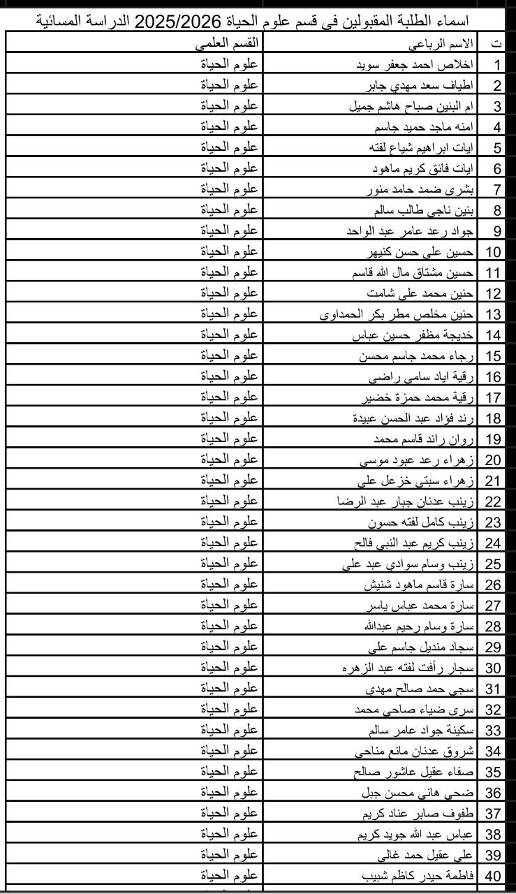 تُعلن كلية التربية/القرنة عن أسماء الطلبة المقبولين في الدراسة المسائية – قسم علوم الحياة للعام الدراسي 2025-2026، وتدعوهم إلى الإسراع في إكمال متطلبات التسجيل خلال الأيام الاثنين والثلاثاء والأربعاء والخميس من الأسبوع الحالي.