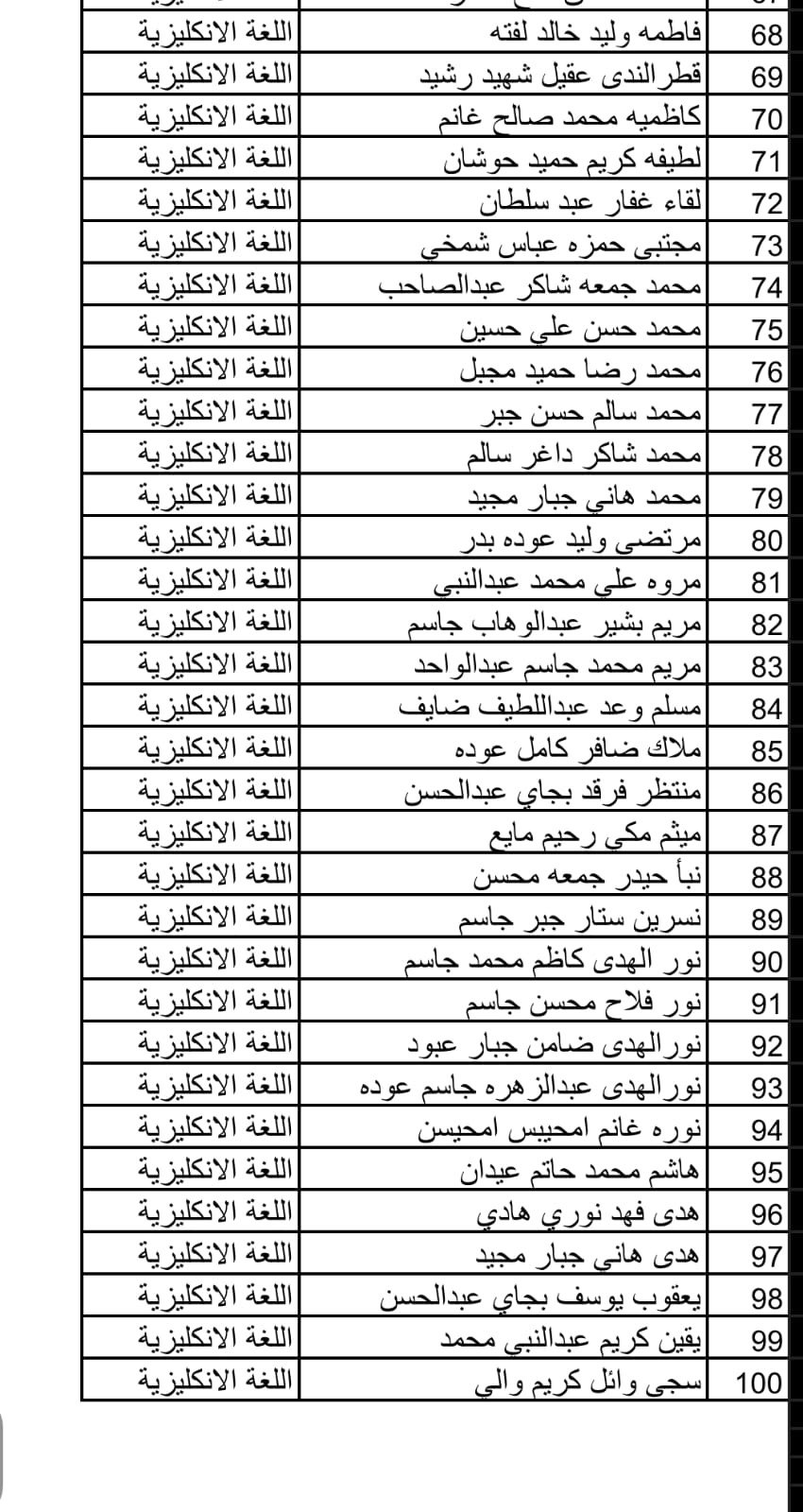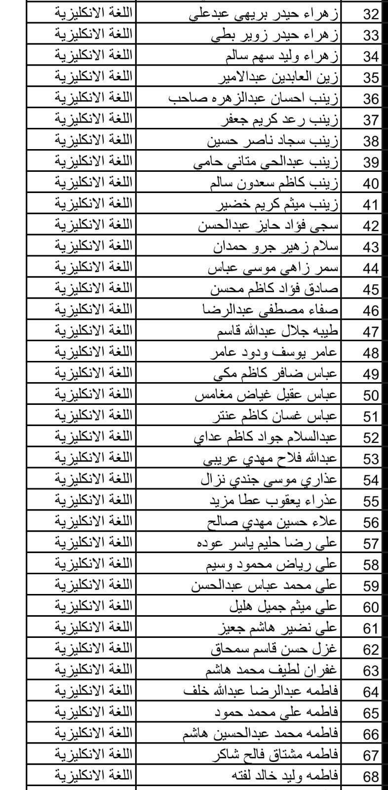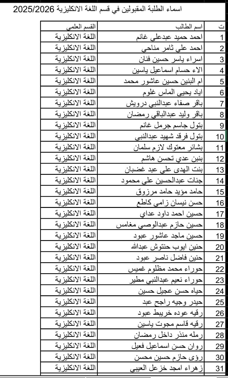 تُعلن كلية التربية/القرنة عن أسماء الطلبة المقبولين في الدراسة المسائية – قسم اللغة الانكليزية للعام الدراسي 2025-2026، وتدعوهم إلى الإسراع في إكمال متطلبات التسجيل خلال الأيام الاثنين والثلاثاء والأربعاء والخميس من الأسبوع الحالي.