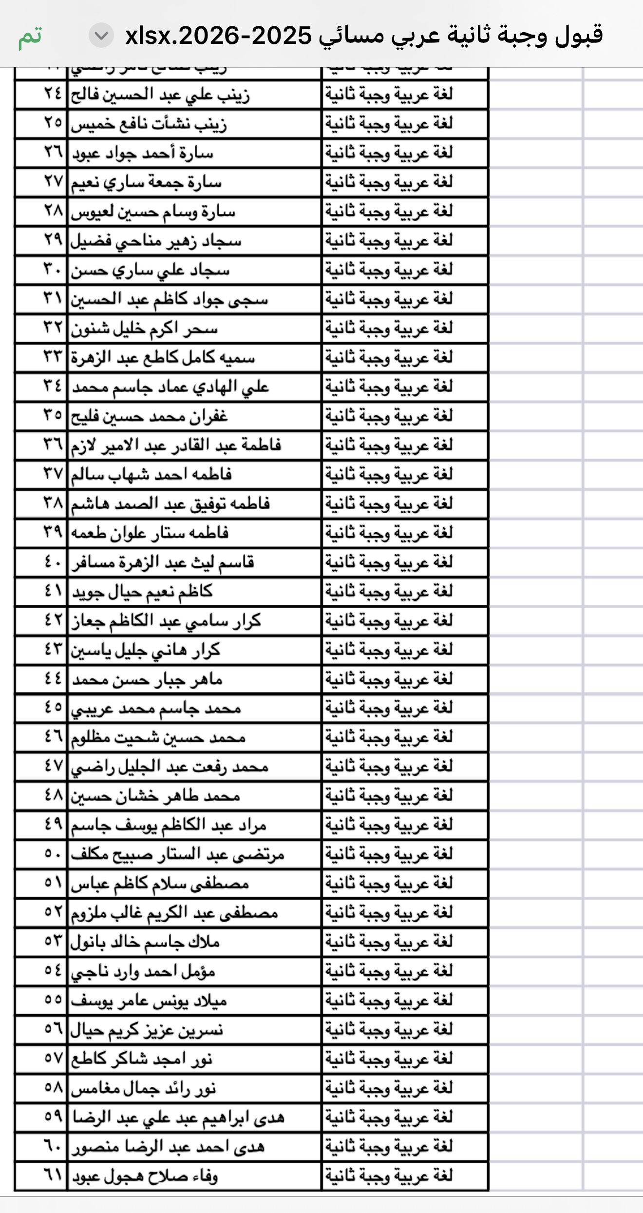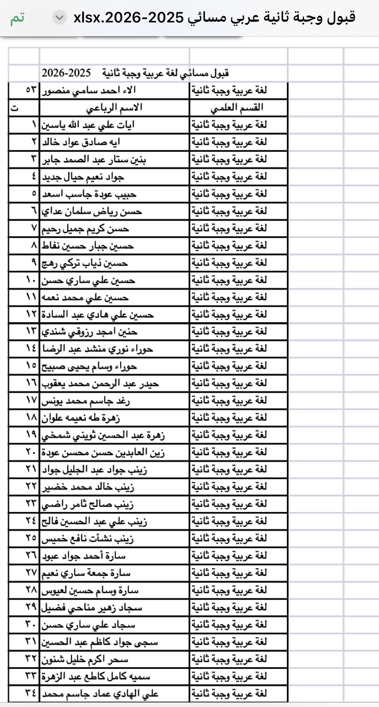تُعلن كلية التربية/القرنة عن أسماء الطلبة المقبولين في الدراسة المسائية – قسم اللغة العربية الوجبة الثانية للعام الدراسي 2025-2026، وتدعوهم إلى الإسراع في إكمال متطلبات التسجيل تكون المدة المحددة للتسجيل ثلاثة ايام فقط