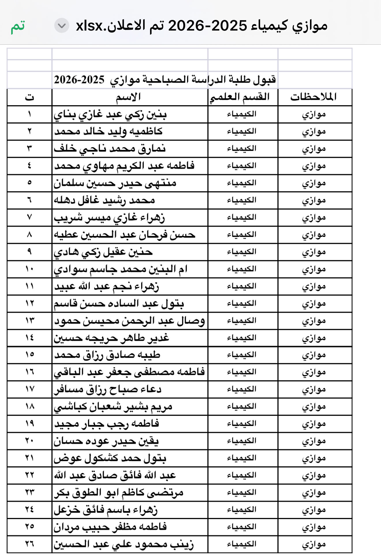 قبولات قسم اللغة العربية وقسم الكيمياء/ الدراسة المسائية الملحق