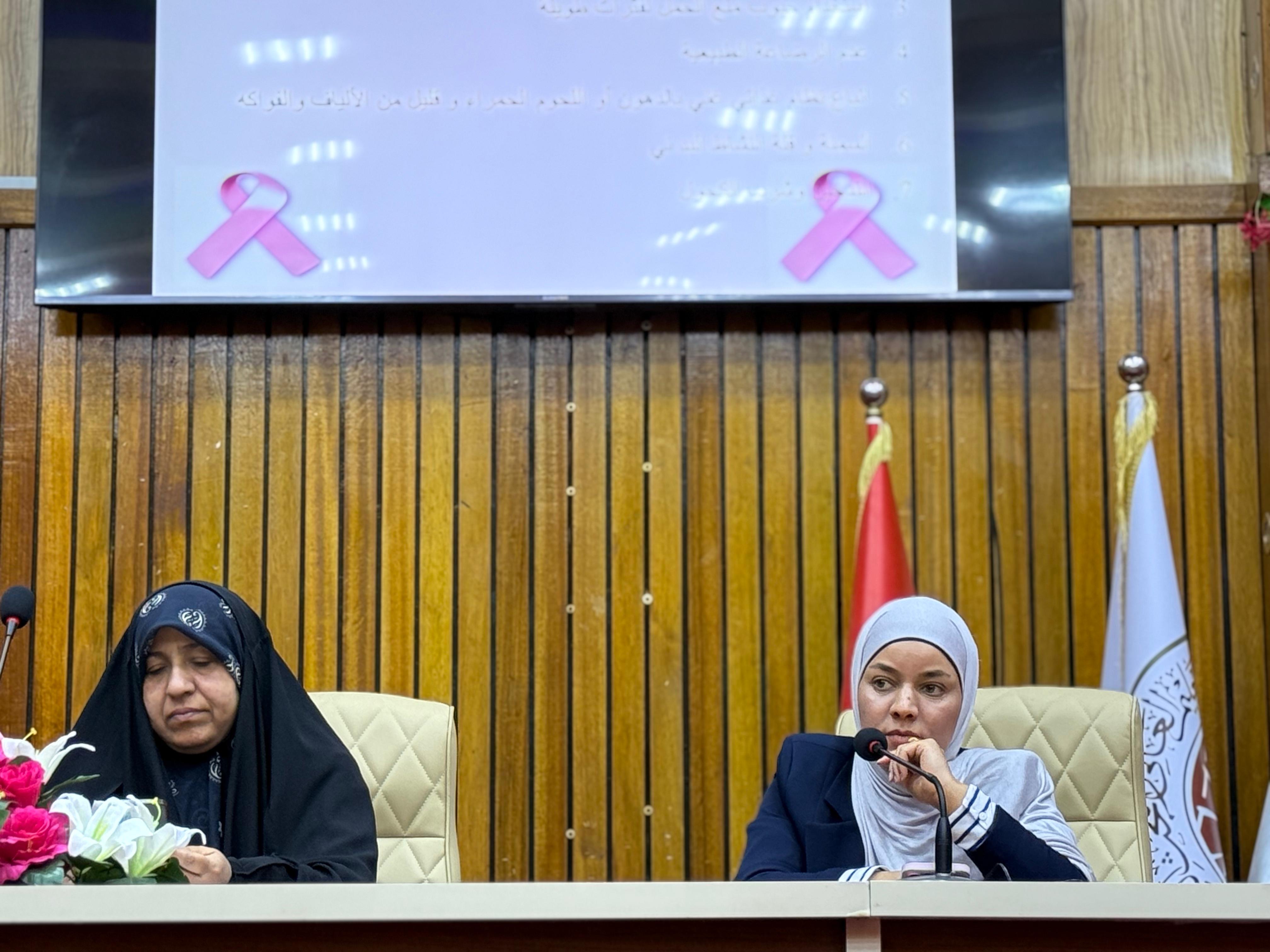 وتضمنت الندوة محاور عدة قدّمتها كل من أ.م.د. حسنة عامر مهوس، وأ.م.د. آلاء سالم كاظم، وم.د. فضيلة قاسم صالح العلي، حيث جرى التعريف بمرض سرطان الثدي وأسبابه وأعراضه والعوامل المساعدة على ظهوره لدى كلا الجنسين، إضافة إلى استعراض طرق التشخيص الحديثة وأساليب العلاج المتطورة، وسبل التمييز بين الأورام الحميدة والخبيثة، مع بيان الآثار الصحية والنفسية المترتبة على التأخر في اكتشاف المرض.