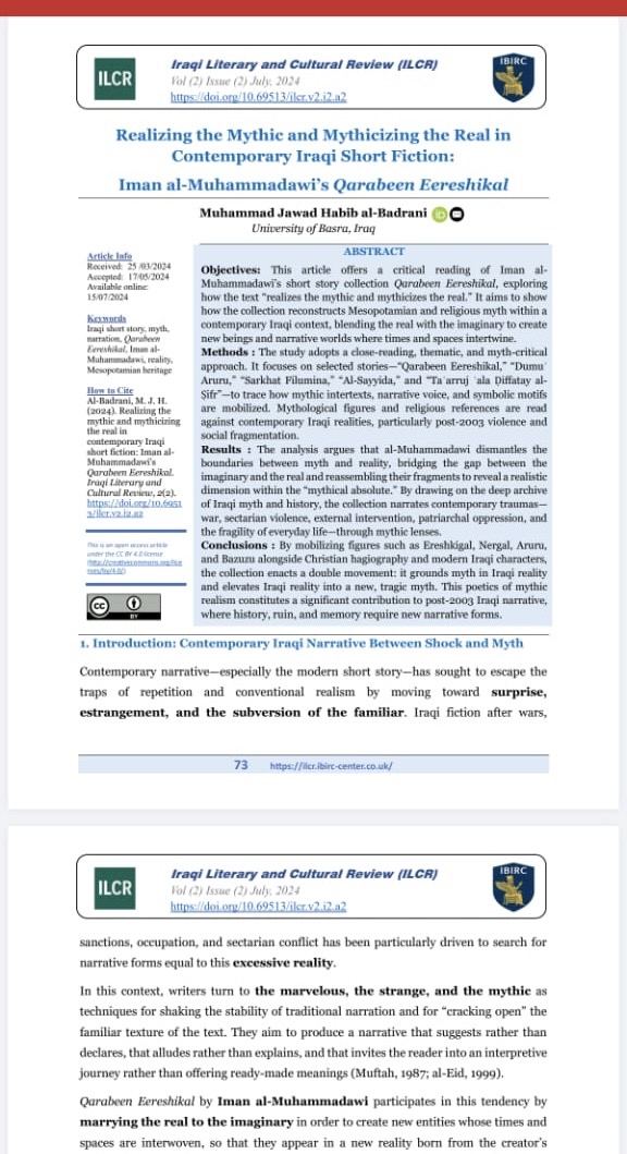 ويتناول البحث موضوع أسطرة الواقع ووقعنة المؤسطر في مجموعة (قرابين إيرشيكال)، من خلال قراءة نقدية تسلط الضوء على التداخل بين الواقعي والأسطوري في القصة القصيرة العراقية المعاصرة، بما يسهم في إثراء الدراسات النقدية الحديثة.