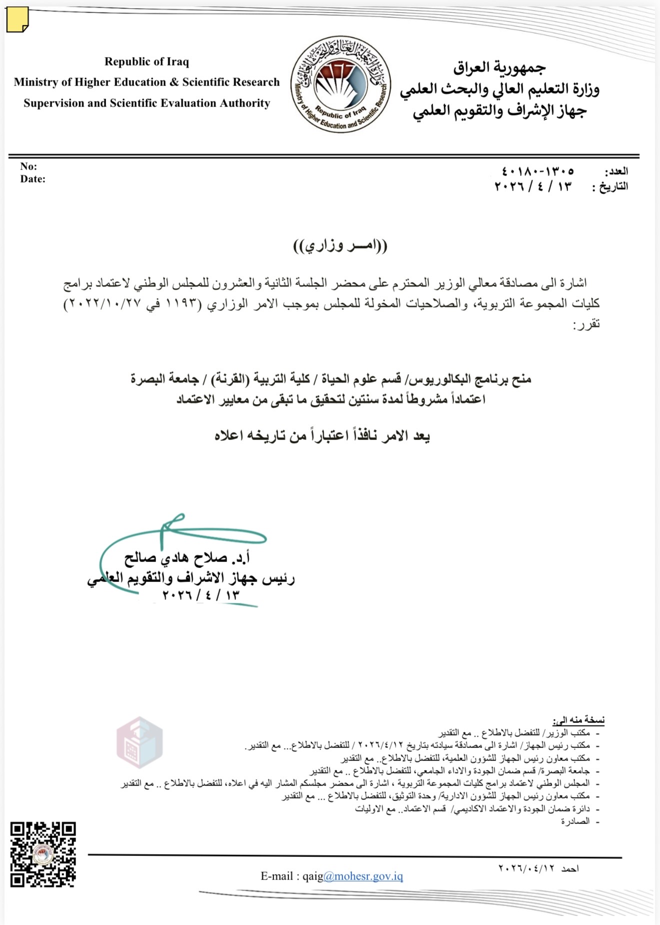 تتقدم عمادة كلية التربية القرنة في جامعة البصرة بأسمى آيات التهاني والتبريكات إلى مجلس الكلية وجميع ملاكها التدريسي والإداري، بمناسبة حصول قسم علوم الحياة على الاعتماد المشروط لمدة سنتين، في إنجاز علمي يعكس الجهود المبذولة للارتقاء بالمستوى الأكاديمي وتحقيق معايير الجودة والاعتماد.